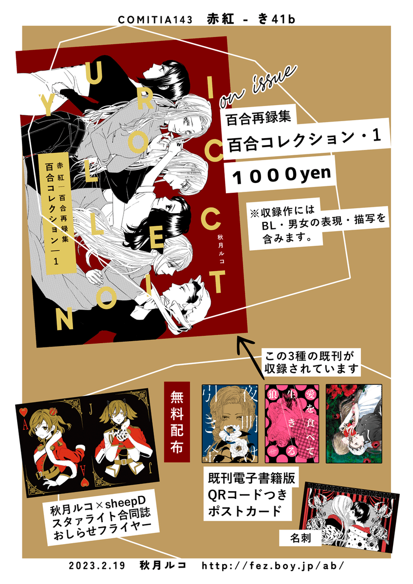 2/19 #COMITIA143 【 き41b|赤紅 】 当日のおしながきです。 👠既刊 「百合再録集」A5/118p/¥1000 今まで発行した #百合 同人誌3冊を収録しています。 加筆・修正・かきおろしはほぼありません。 ⚠BL・男女の表現・描写を含みます。 ⚠書籍のみ/電子書籍版なし 詳細は以下ツリーに続きます→