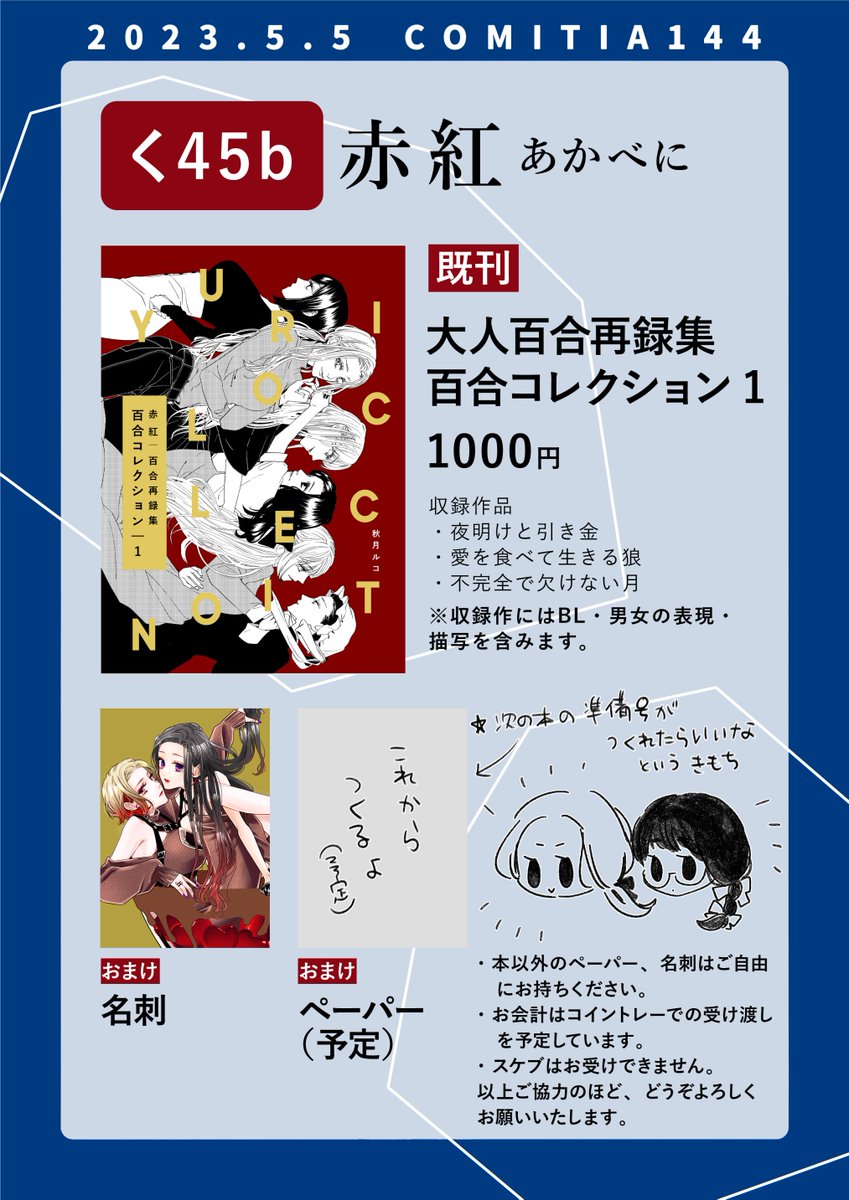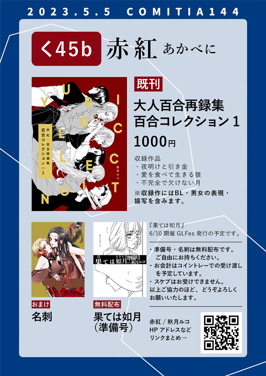 5/5 #COMITIA144お品書き (改) 【 く45b - 赤紅 】 既刊✅創作大人 #百合 同人誌再録集 ✨🆕名刺 ※無料配布 ✨🆕次回作準備号 ※無料配布 創作大人百合のスペースです。 どうぞよろしくお願いいたします。 #COMITIA144 #COMITIA twitter.com/_luco/status/1…