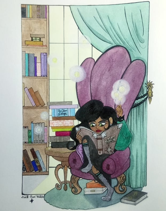 Day III: Book Witch ✨📚✨ Yup this is my little witch, reading how to light her day off, and yup, she loves Terry Pratchett as well💫 #marinablutkynaillustration #iniwitches #witchtober2019 #inktober2019 #ink #spell #craft #pagan #nature #library #magic #books #terrypratchett