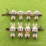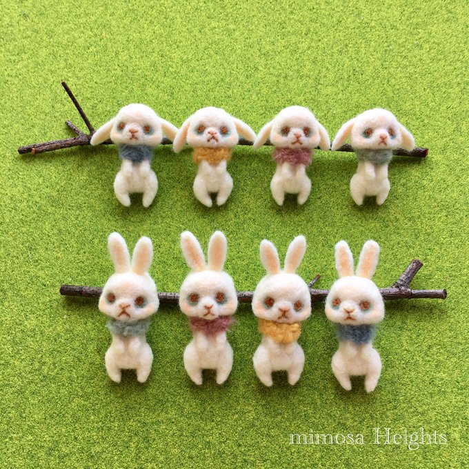 9 27 ○うさうさブローチ○ 小さなうさぎのブローチです。 たち耳とたれ耳の2種類、4色のバリエーションを作りました。 この子たちはクリマへ連れて行きます! #ミモザハイツ #羊毛フェルト 23/05/12 19:55