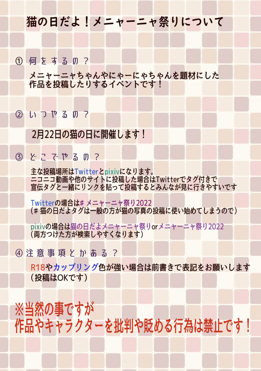 36 66 #メニャーニャ祭り2023 一ヶ月前になったので告知 今年もやります!猫の日だよメニャーニャ祭り!! よろしくね! 23/01/22 03:10