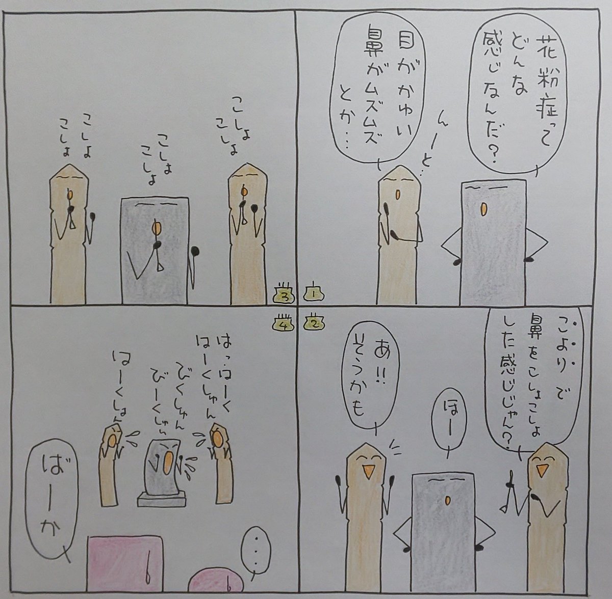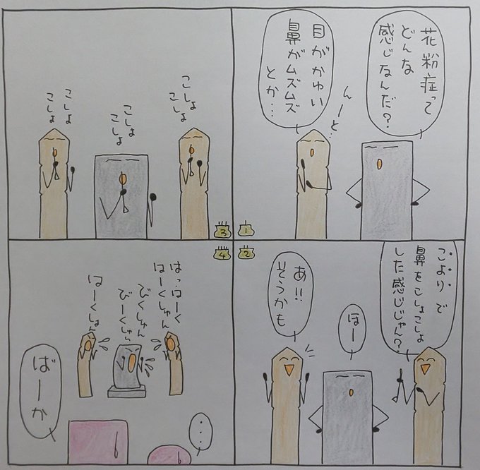 1 2 どーしても、花粉症はどんなものなのか知りたい人達…😂 こより→コショー→……次は? #イラスト #漫画 #4コマ漫画 23/03/12 18:05
