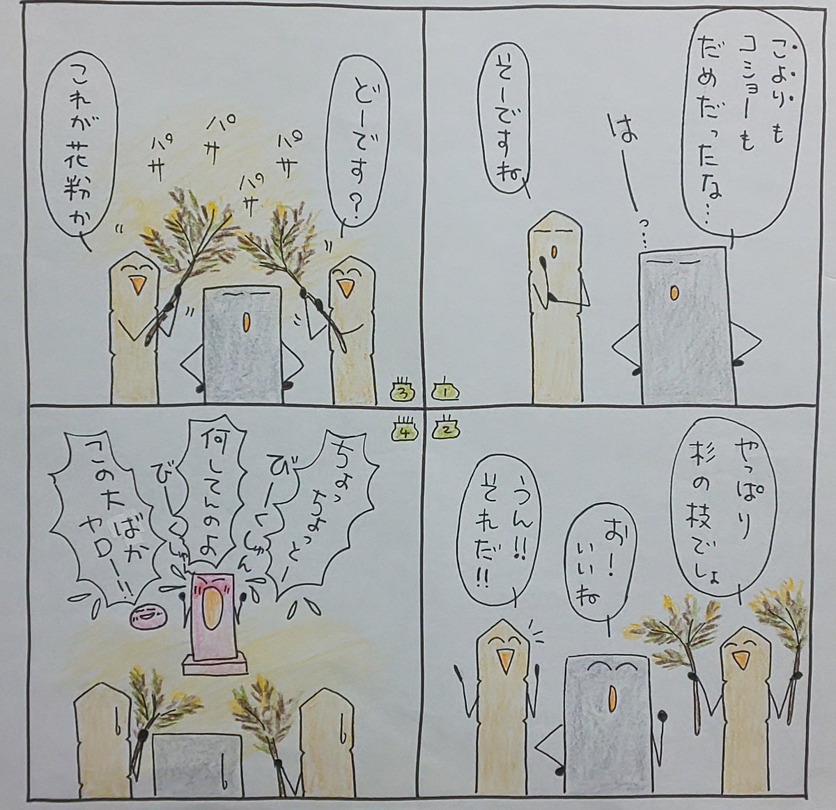 杉の枝で試しても、花粉症がどんなものなのか…分からなかった墓石さんなのです😂 #イラスト #漫画 #4コマ漫画