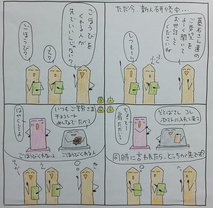 1 6 新人研修 ① そとばさんは、不定期に新人さんが入ってきます✨ そりゃあ、ご褒美くれる方を優先したいよね🤭 #漫画 #4コマ漫画 #イラスト 23/03/19 19:07