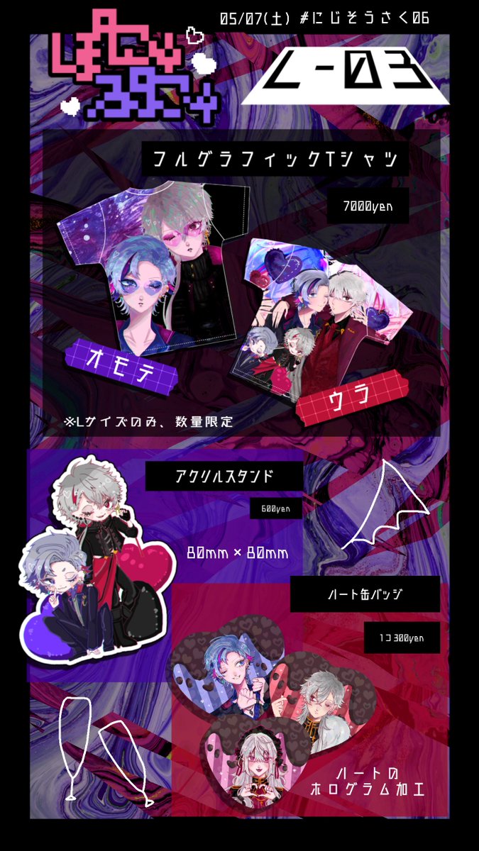 【ぽにゅぷにゅ L-03】 #にじそうさく06 にて頒布するグッズのお品書きになります! 当日はわたし🥂(@lil__cos )とるきちゃん🎲(@lemontea_0504 )がコスプレしながらお待ちしております😚🖤 ⚠︎全体的に数が少ないです 残った場合は後日通販になります