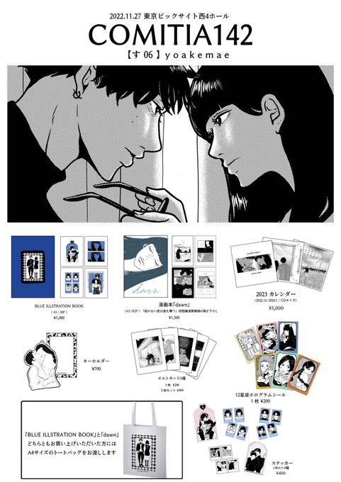 #コミティア142 のお品書きです🌌 漫画本、イラスト本、カレンダーや新作の12星座ホログラムシールなど🫧 漫画本とイラスト本をお買い上げの方にはトートバッグも付いてきます。 スペース「す06」yoakemaeでお待ちしております #COMITIA142 #コミティア