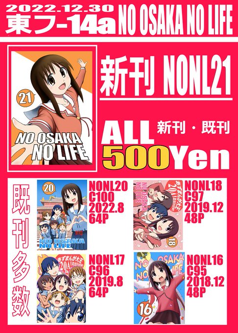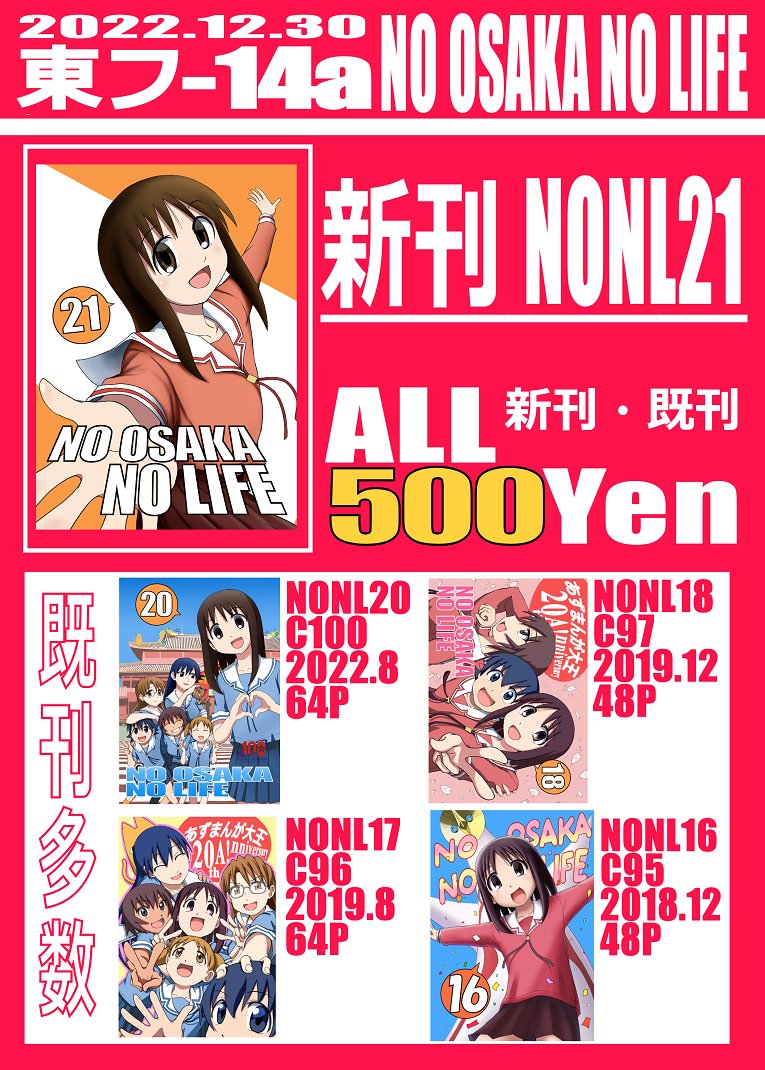 告知失礼します。 あずまんが大王の大阪さんサークル「NO OSAKA NO LIFE」C100夏コミ新刊『NONL21』の書店予約開始です。今回21巻ですが20以前を読まなくても楽しめる内容です。ゲスト様情報は追ってお送りします。 メロン様:melonbooks.co.jp/detail/detail.… とら様:ecs.toranoana.jp/tora/ec/item/0…
