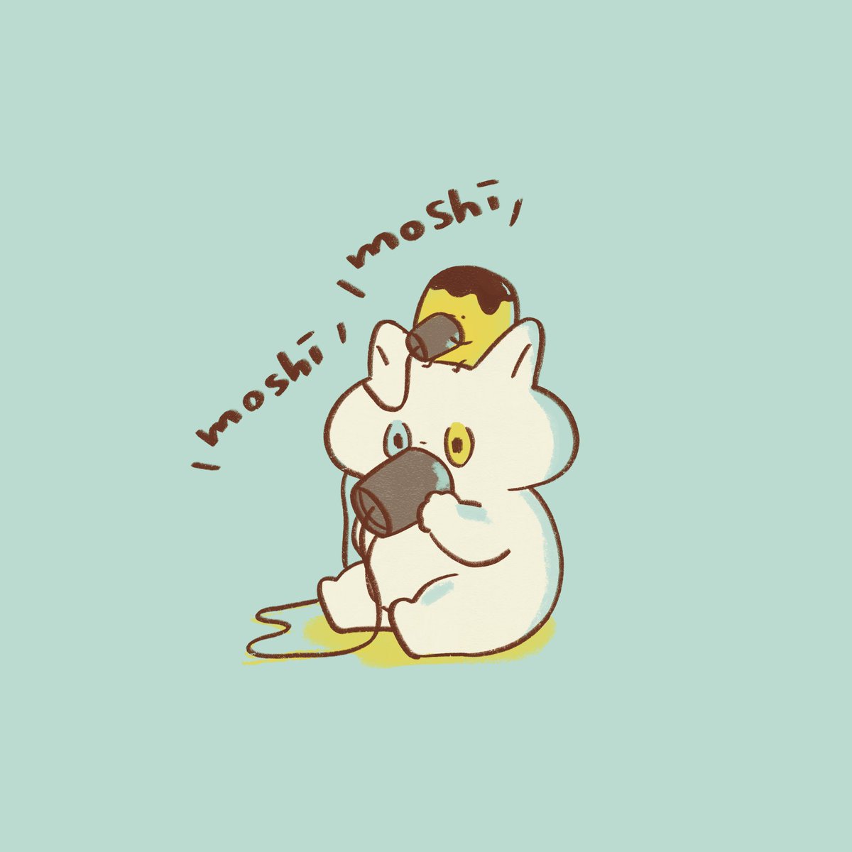 楽しかったな〜を思い出して寝る前にらくがき🐱🍮 もちおのもちもちボディも大好きだけど潤んなおめめが凄く好きです🥰 またこの構図で描き直したい!