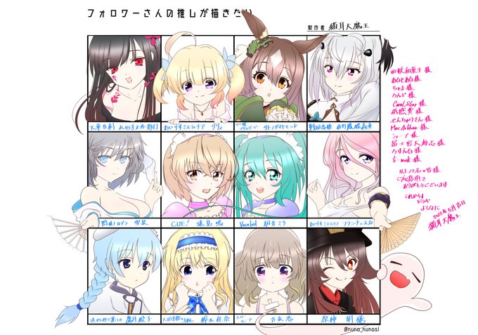 #フォロワーさんの推しが描きたい 大変お待たせ致しました。 各作品のタグは……いらないよね?w 非常に短時間での募集にも関わらず、12名もの方にご応募いただきました事、改めて御礼申し上げると共に、滑り込めなかった方にはお詫び申し上げます。 また機会があれば是非。 twitter.com/_nekomimidai…