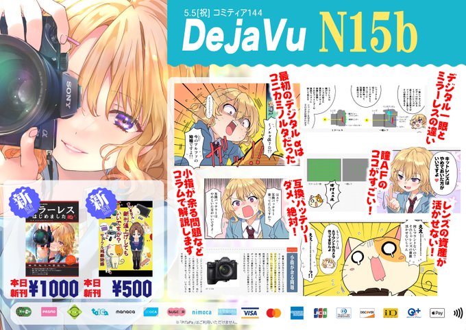 【N15b】DejaVu #COMITIA144お品書き です。 新刊(左)『ミラーレスはじめました』デジタル一眼レフからミラーレスに買い替えたお話。漫画とコラム解説。 『サークル残酷物語』はここ2~3年ですっかり様変わりした同人活動の物価上昇を愚痴る。コスト高に知恵を絞 #コミティアお品書き #COMITIA144
