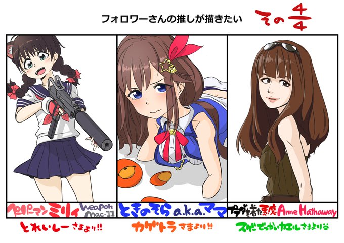 #フォロワーさんの推しが描きたい ヨンブンノヨン!終わり~!…結局いつもラストが遅いすみません😭 小柄なミリィには独断と偏見と好みでマック11☆ お次!ママにもたまには沈んで貰おうと…🙄 アンさん!リアルっぽくなくアニメ感?だすのが大変でした😆 皆様お付き合いありがとうございました!