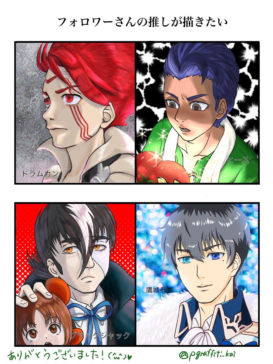 #フォロワーさんの推しが描きたい @ahiru_nasutoma さん @shiina_Duo さん @custarte12 さん @rnavcc さん お待たせしました🙇🏻♀️💦 全員描いたことのないキャラなので変だったら申し訳ないです😓 貴重な機会ありがとうございました!