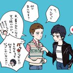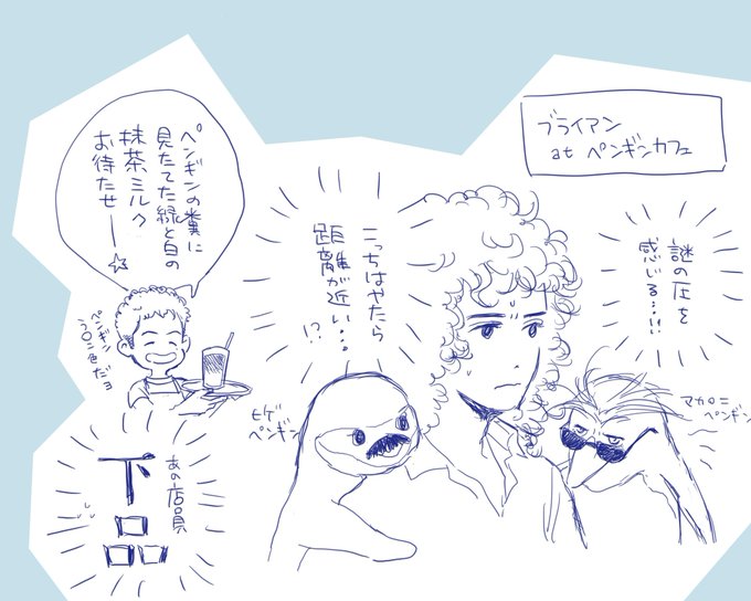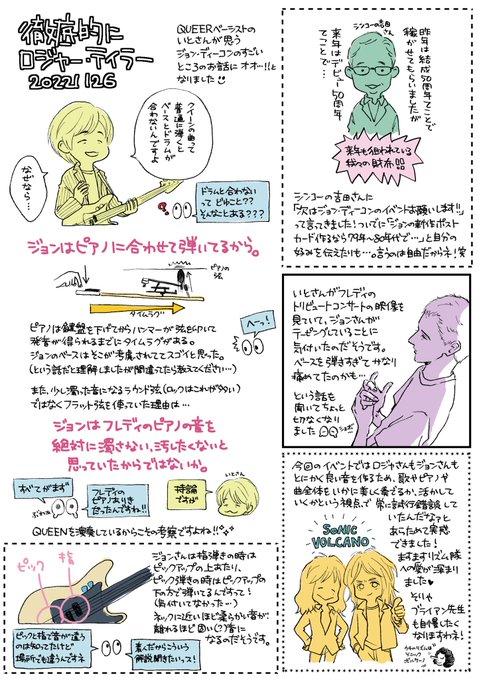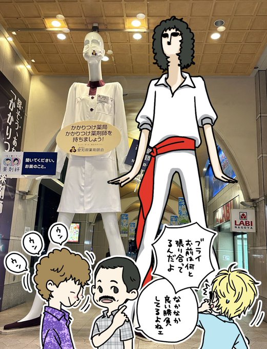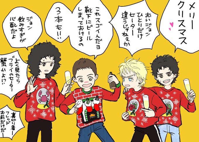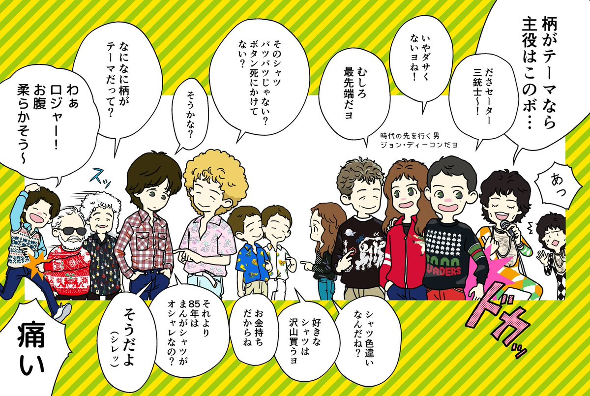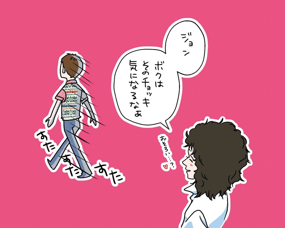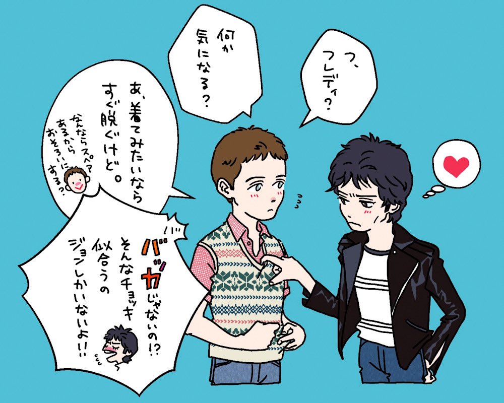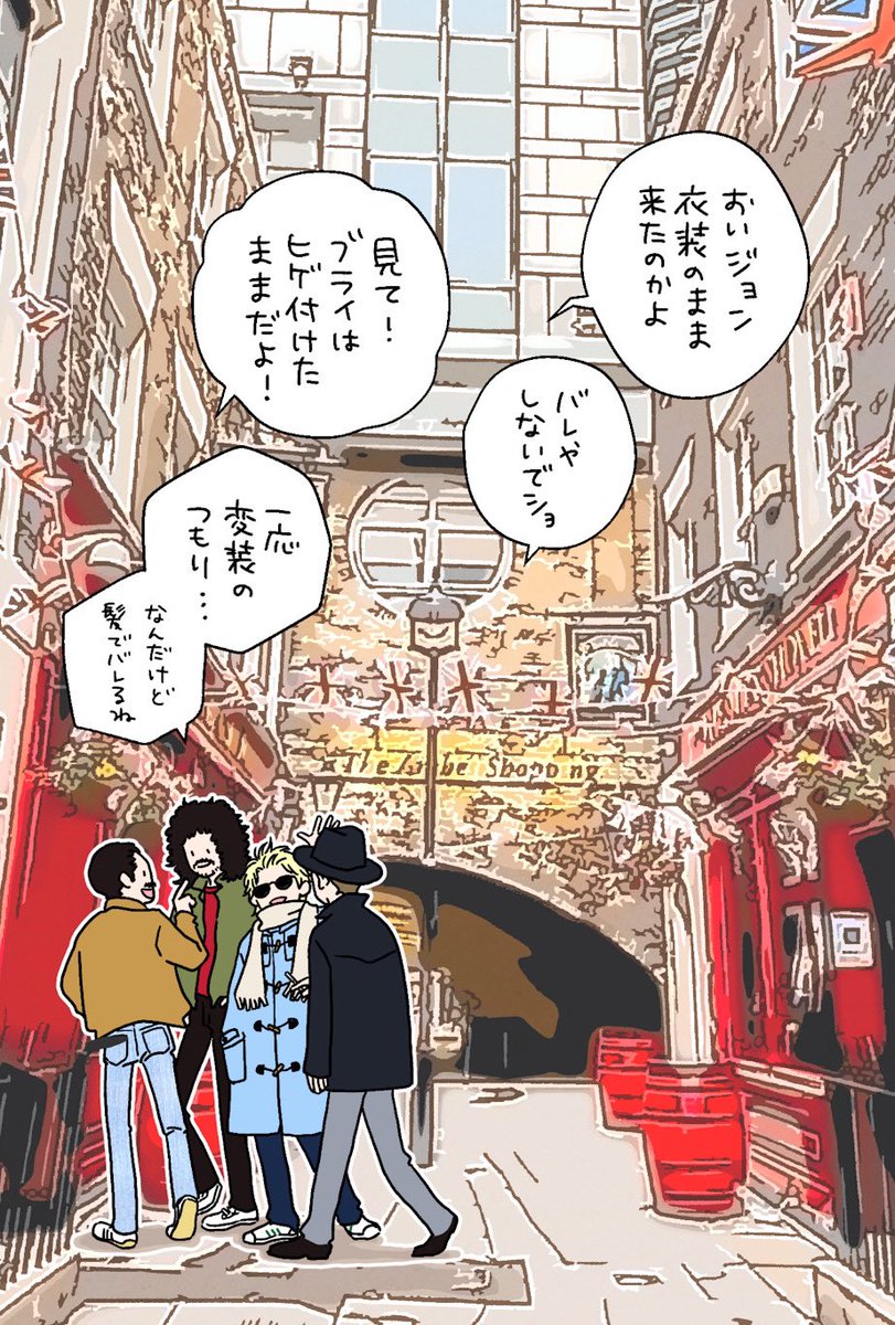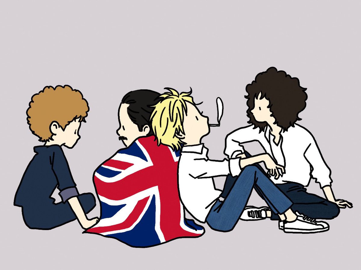 A Kind of MagicのMV撮影の合間にパブへ行くメンバーの妄想&ロジャさんに可愛い色のダッフルコート着せたい欲を満たした絵を描きました😌 twitter.com/neba_zaemon/st…