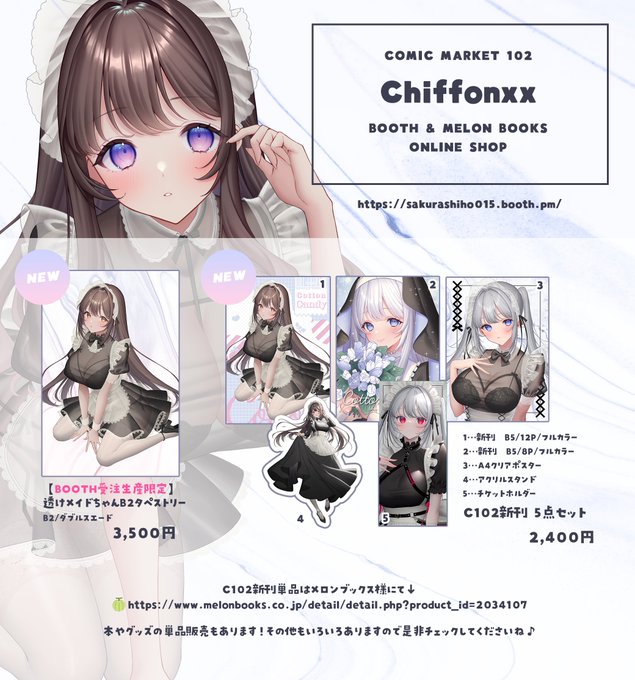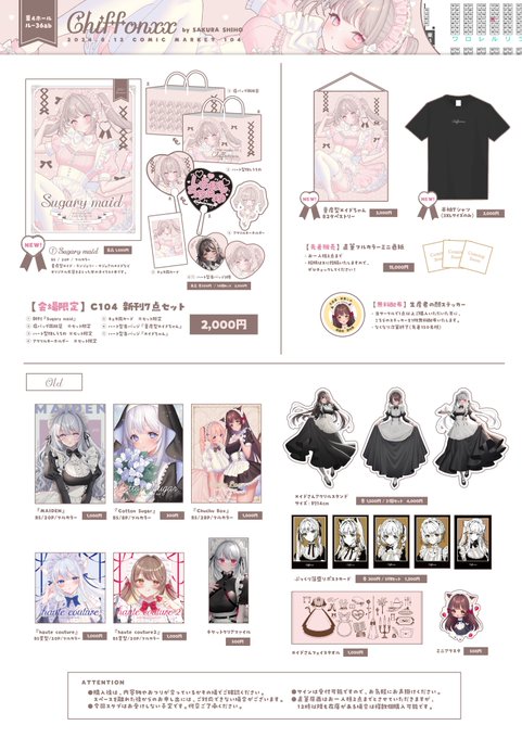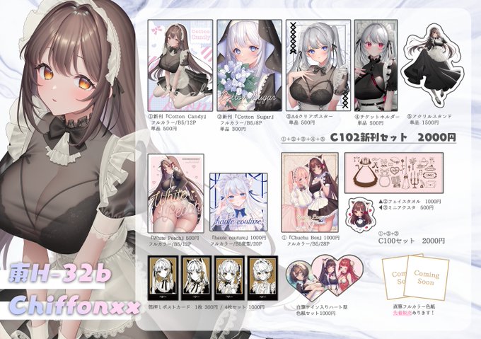 【 #C104お品書き 】 🎀-------------------------🎀 8月12日(月) 2日目 #C104 東4ホール【 ル-36ab 】Chiffonxx 🎀-------------------------🎀 夏コミのお品書きができました!新刊セットと新作グッズをご用意しました✨当日はどうぞよろしくお願いいたします💗ぜひ遊びに来てねー! x.com/i/web/status/1…