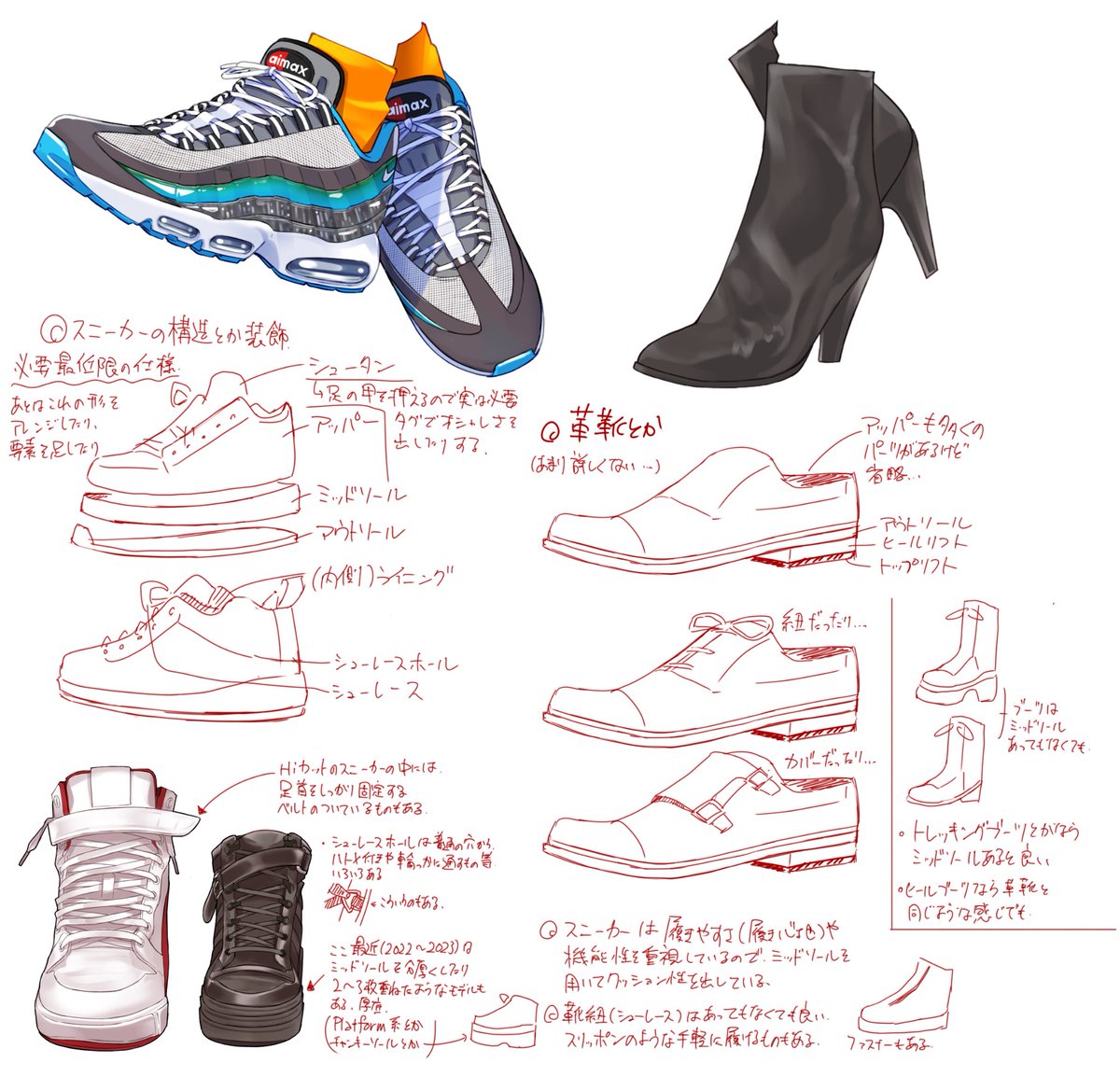 自分が普段やってるスニーカーのラフのとり方とか、スニーカーを描く際におさえたい要素とかを簡単にまとめてみました 参考になれば幸いです