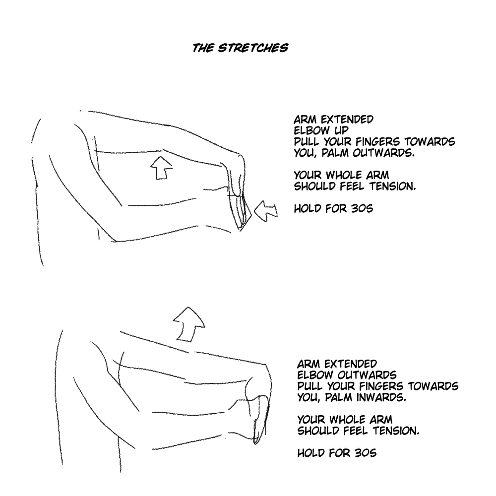 from a physical therapist. i did these weekly. drawn lefty POV as it is mine, but do that to your drawing arm. it'll stretch and build up strength in the area often responsible for wrist tendonitis. twitter.com/ChachaTortuga/…