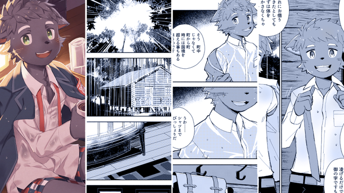 pixivに試し読み8pほどupしました~よろしくね! 新刊|郵旅配達士の猫少年とどしゃぶりの森の小屋で一晩過ごす話 | steelwire/鉄線 #pixiv pixiv.net/artworks/10158…