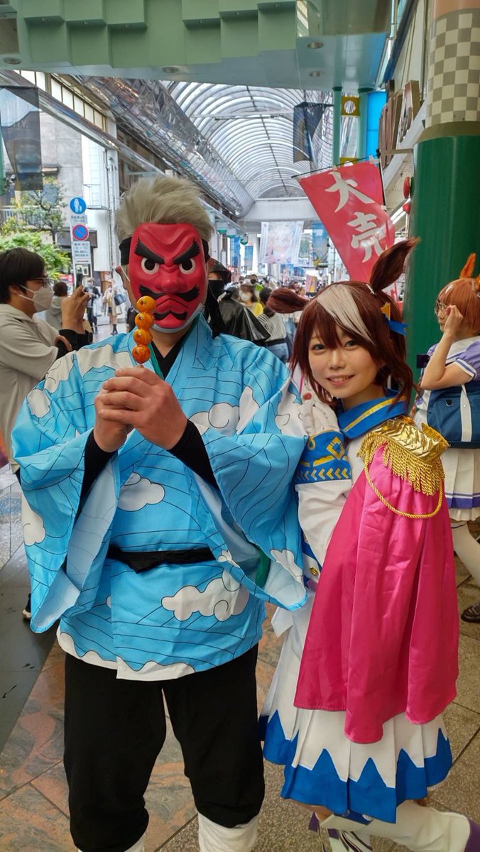 一日目、鋼鐵塚蛍さんにお会いしました このお面自作だそうです(๑•̀ㅁ•́ฅ✨ おだんごも作ったようです! 本物みたいでした…じゅるり(*´﹃`*) AKITOさん(@AKITO86436855 ) #とちてれアニメフェスタ2023 #めぐみん #cosplay