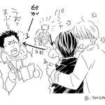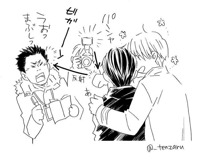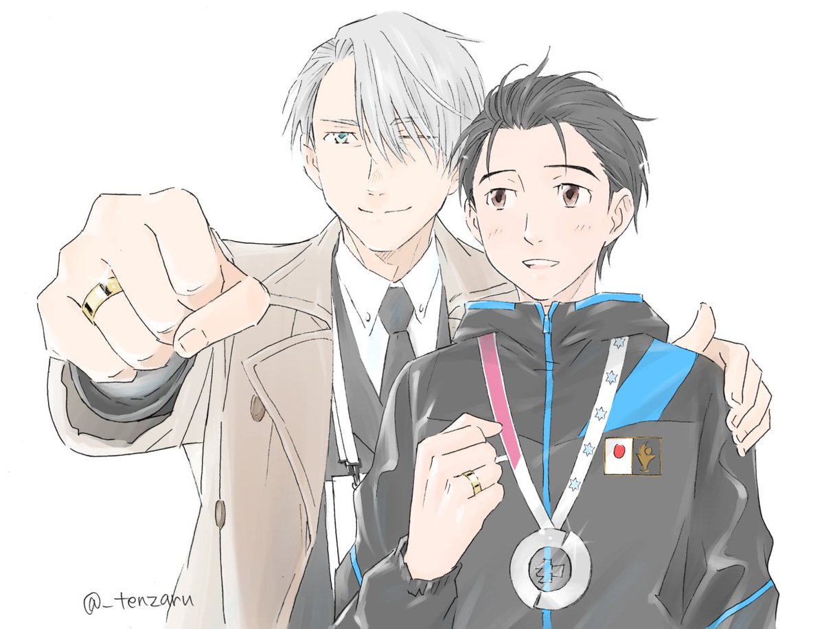 105 586 【YOI】中村勘九郎さん(当時勘太郎さん)と前田愛ちゃんの婚約発表の時のグーで指輪見せるのに萌えてたので、ヴィク勇でやってみたらと思って描いたけどほぼヴィクトルの牽制になったやつ。二枚目は流れ弾に当たる諸岡アナです。 18/09/09 10:12