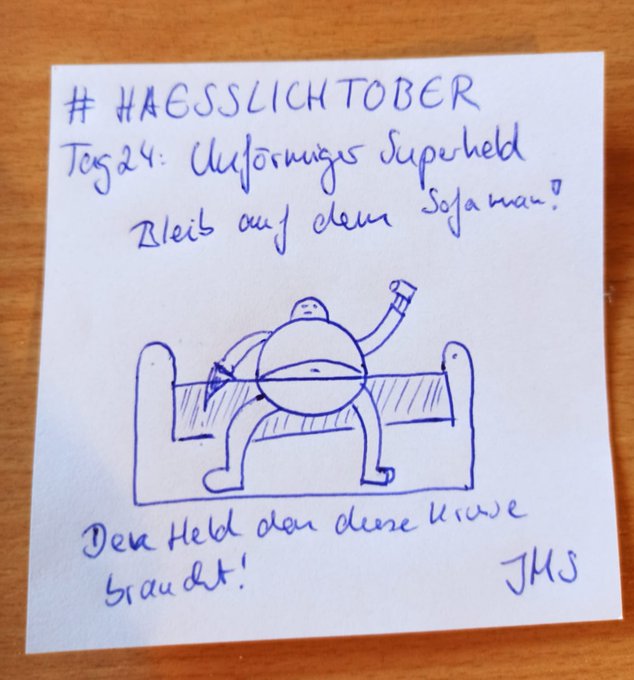 #haesslichtober. Tag 24: Unförmiger Superheld. Die Krise geht weiter. Sie wird sogar noch schlimmer. Doch in Zeiten der Not erheben sich Helden. Jeder von uns kann es sein. Der Held den diese Krise braucht: Bleib-auf-dem-Sofa-Man! #inktober #drawing #uglytober