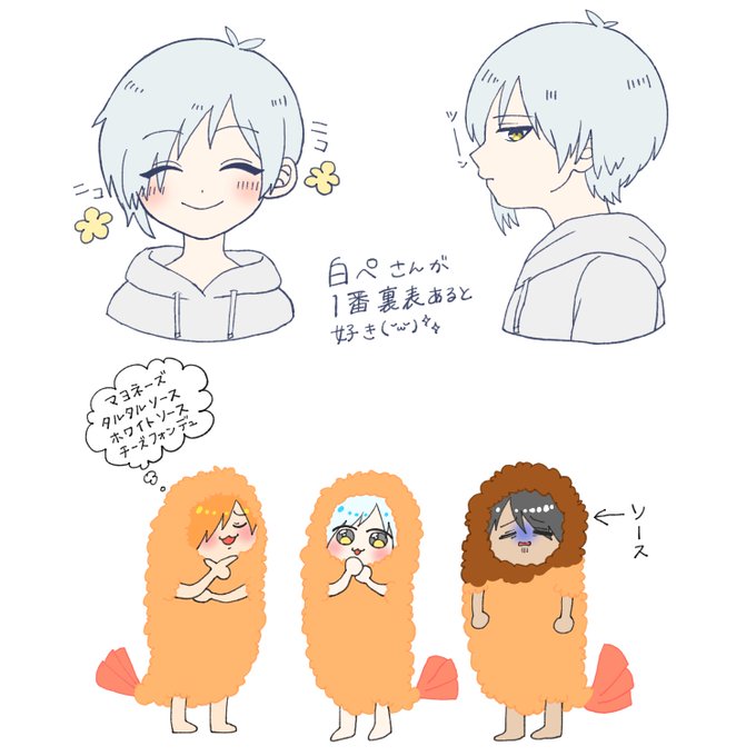 6 49 #ぺんちゃんの絵本 白ぺさん色合いめちゃめちゃ好きだ〜 🧡🤍🖤 エビフライ兄弟並べたら可愛い( ˇωˇ )✨ 白ぺさんのソースの種類永遠に考えてる 20/08/01 07:57