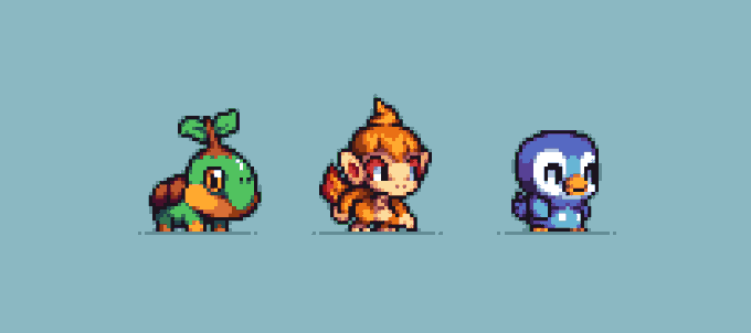 Generation IV Turtwig, TChimchar, Piplup #Pokemon #BrilliantDiamond #ShiningPearl #pixelart #ドット絵 #aseprite