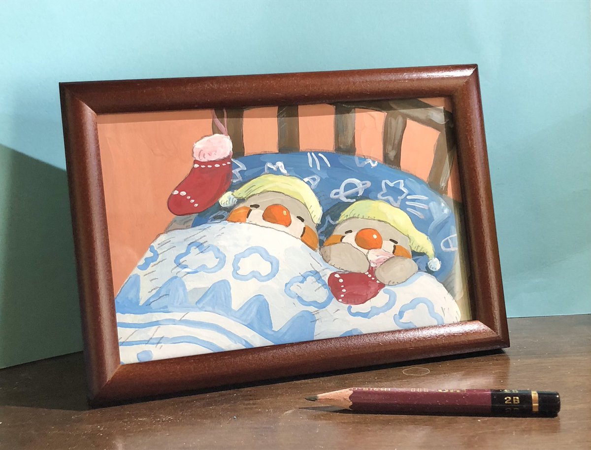 水彩ガッシュ🎨 聖なる夜、楽しみに眠る minne水彩原画販売minne.com/@waffu サンタさんに何をお願いしたのかな…🌟 明日は文鳥さん! デジタルの原案🎄キンカくんたちネットプリントも同時配信です コンビニ、色味は良くないです!💦 下に無料データダウンロード先も載せときます🌟