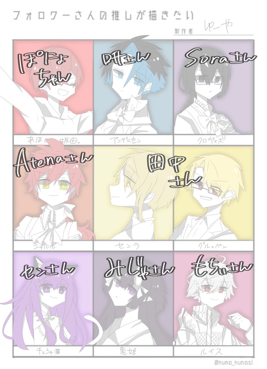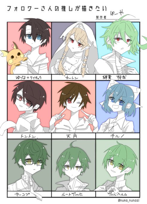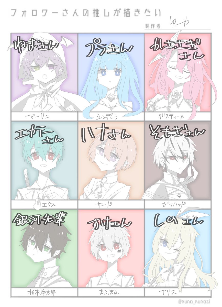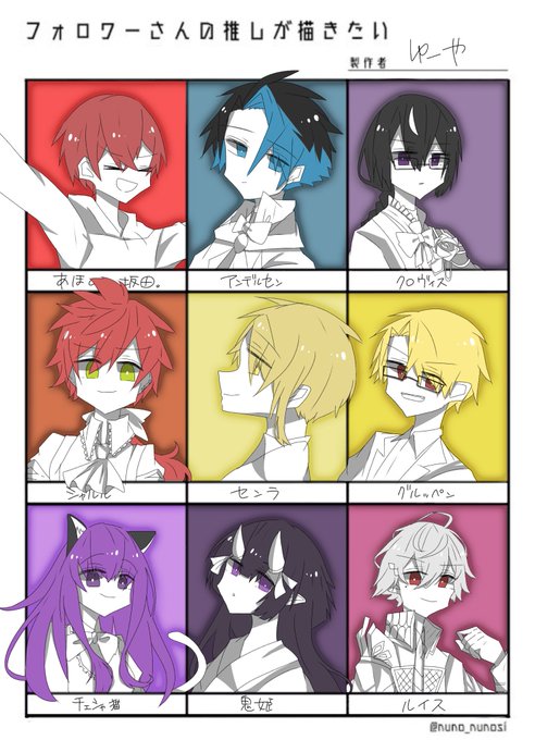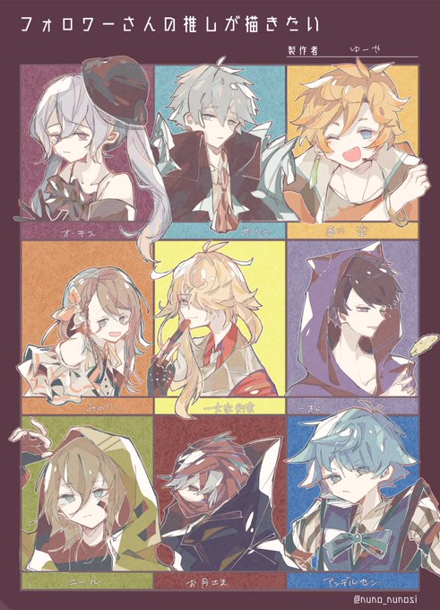 @yukimohuusagi 、@pura444 、@hinagi1035 、@hekate310 、@hana_grimms 、@sosogi_yomogi 、@ginga_1948 、@uni_ki_no_tsuki 、@shino_082 今回は「推しわっかんね!!!多分この子だよね!!」っていう方多いです…… #フォロワーさんの推しが描きたい