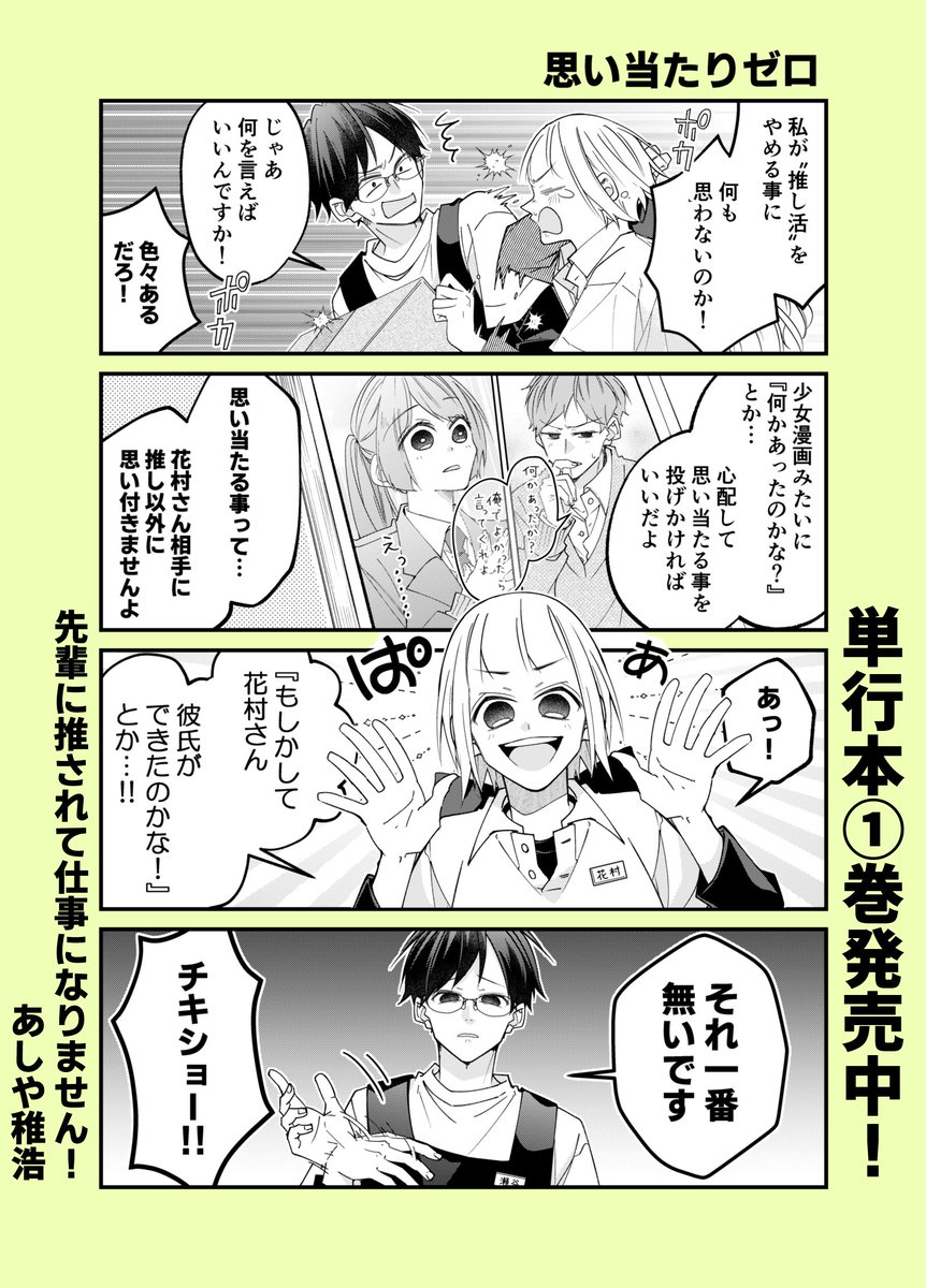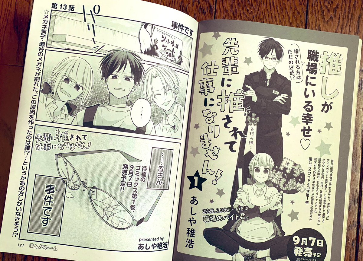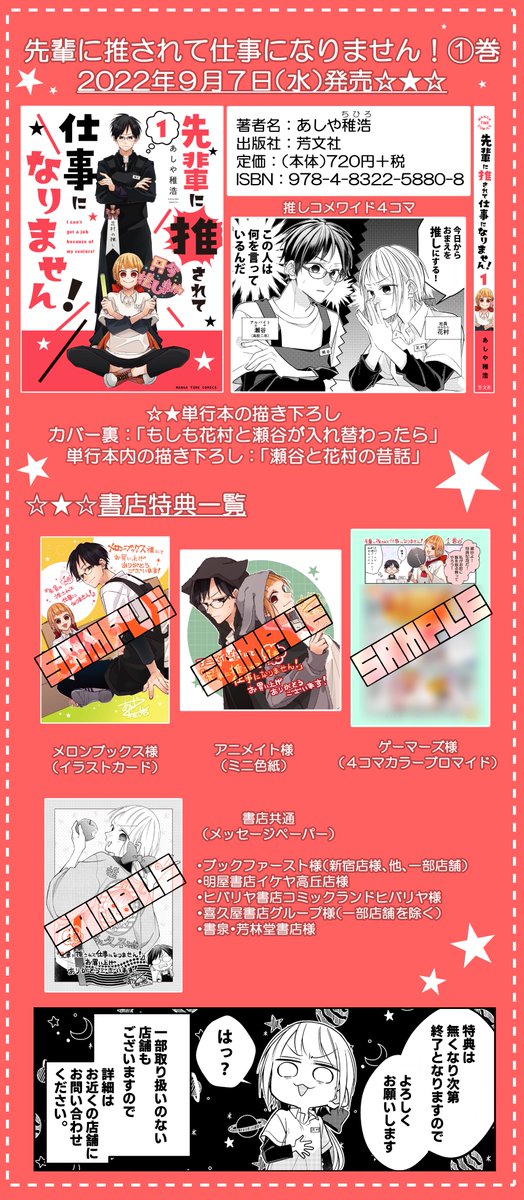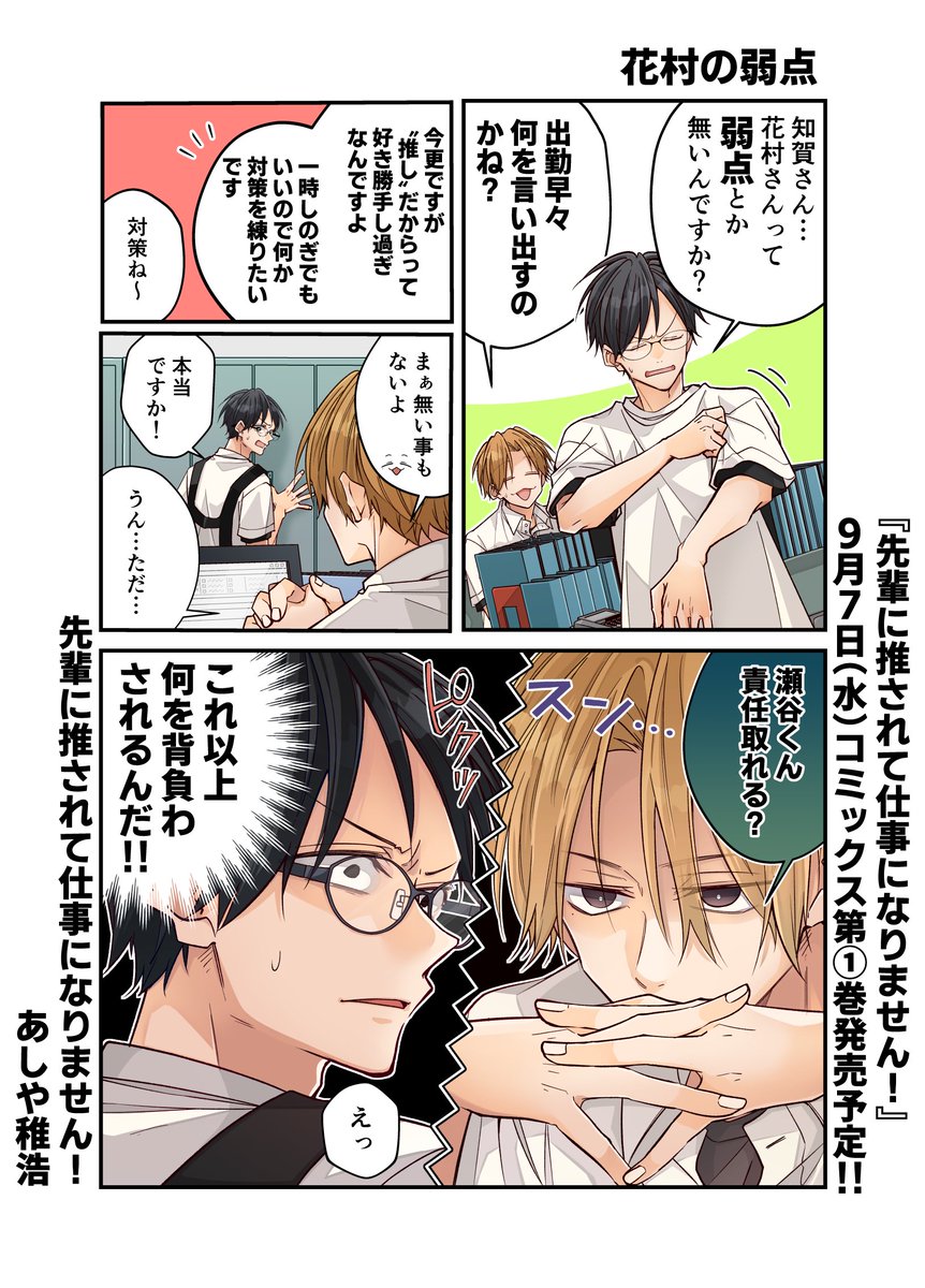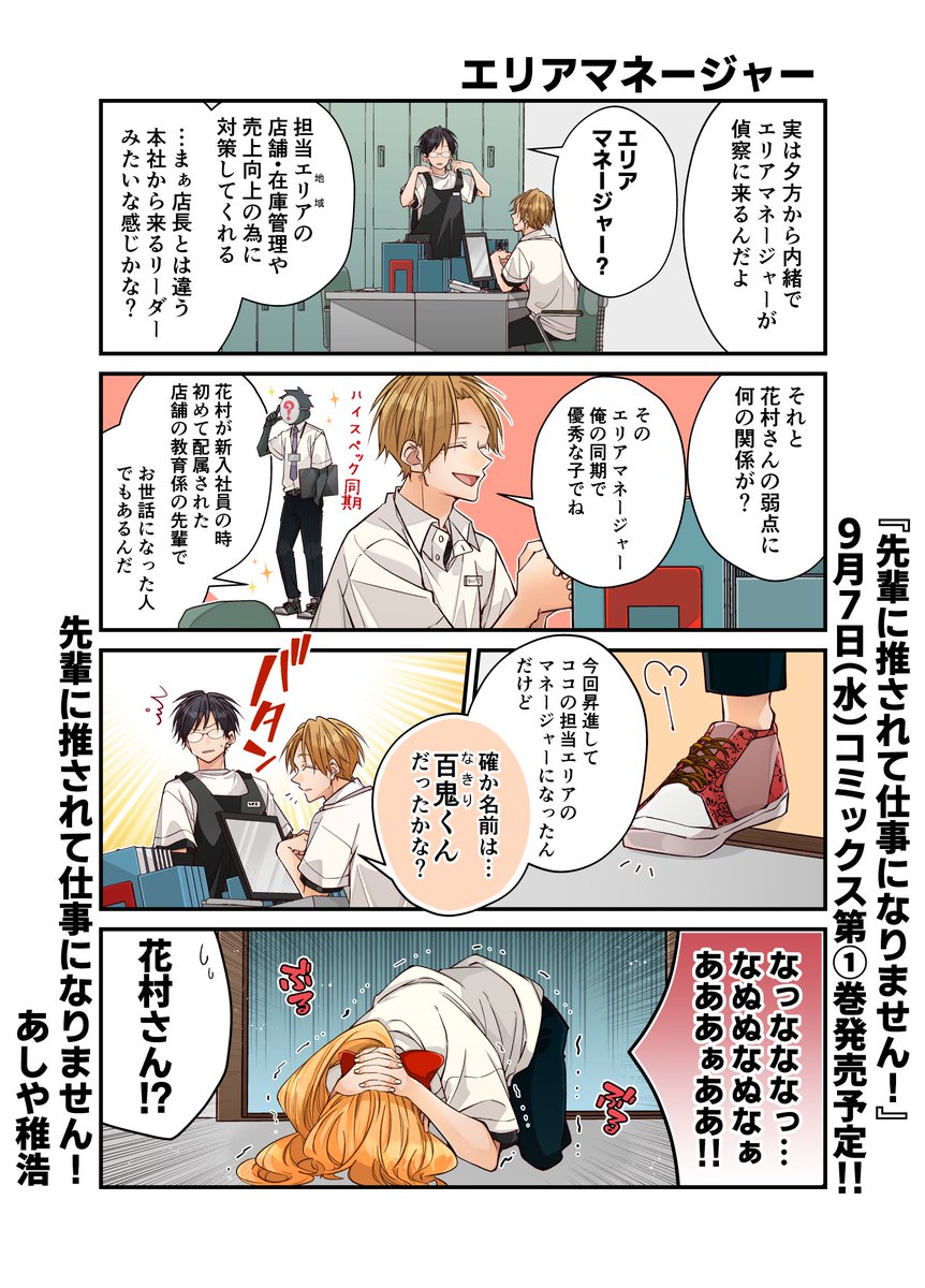 『先輩に推されて仕事になりません!』第①巻が9月7日(水)に発売されます!特典も各書店様で色々と描かせていただきました!お手に取って頂けたら嬉しいです。ワイド4コマなので淡々と読めるかと思いますので書店でお見掛けした際はよろしくお願いします! twitter.com/a04chr/status/…