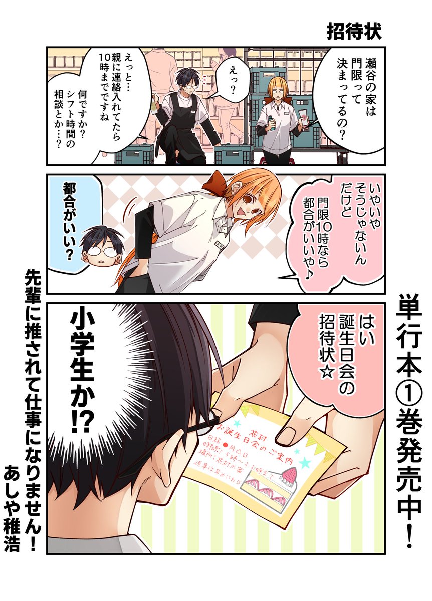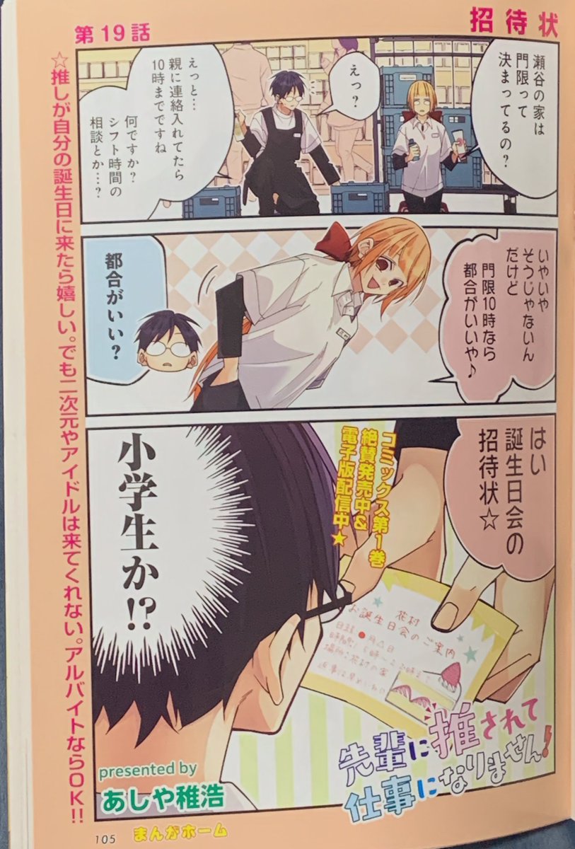 本日発売の芳文社『まんがホーム3月号』にて『先輩に推されて』19話が掲載されております!今回は花村の誕生日会です!表紙カットと巻中カラー描かせていただきました!コミックス第①巻&電子コミックも発売・配信中です!よろしくお願いします✨ twitter.com/a04chr/status/…