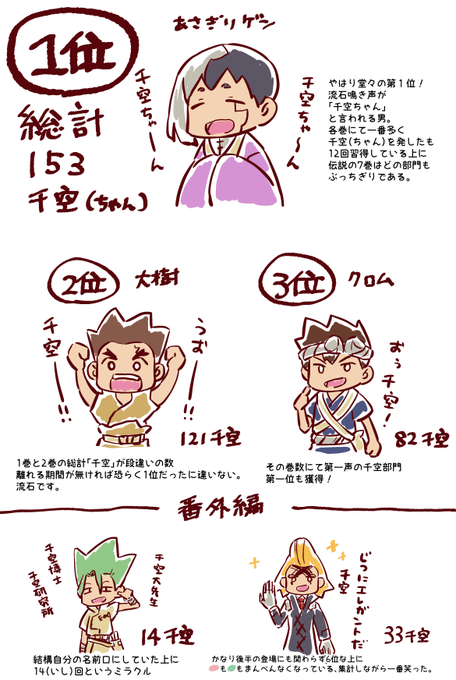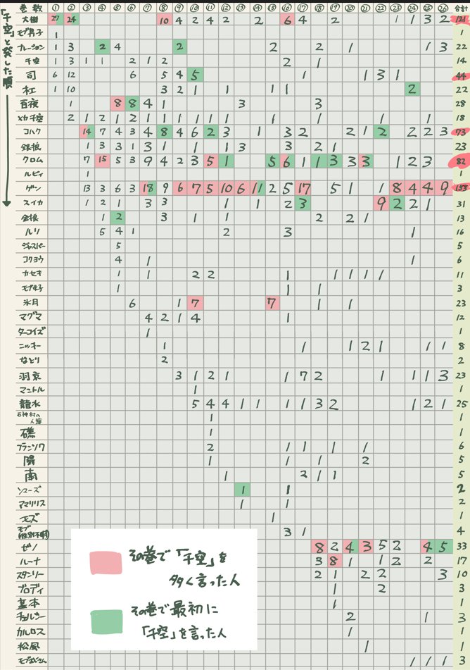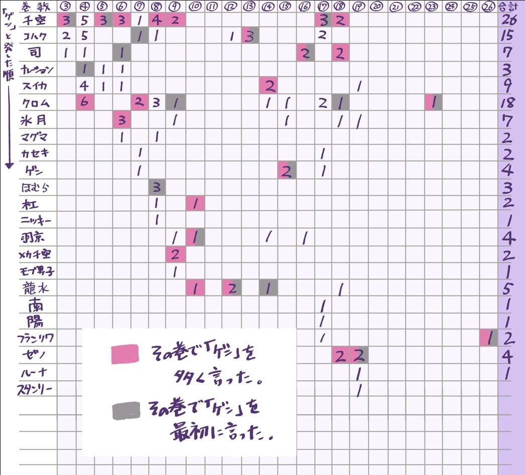 原作コミック全26巻で誰が一番「干空」と言ったか&「ゲソ」といったかのデータです(漏れがある場合があります)それでも千ゲ優勝でした以上です。