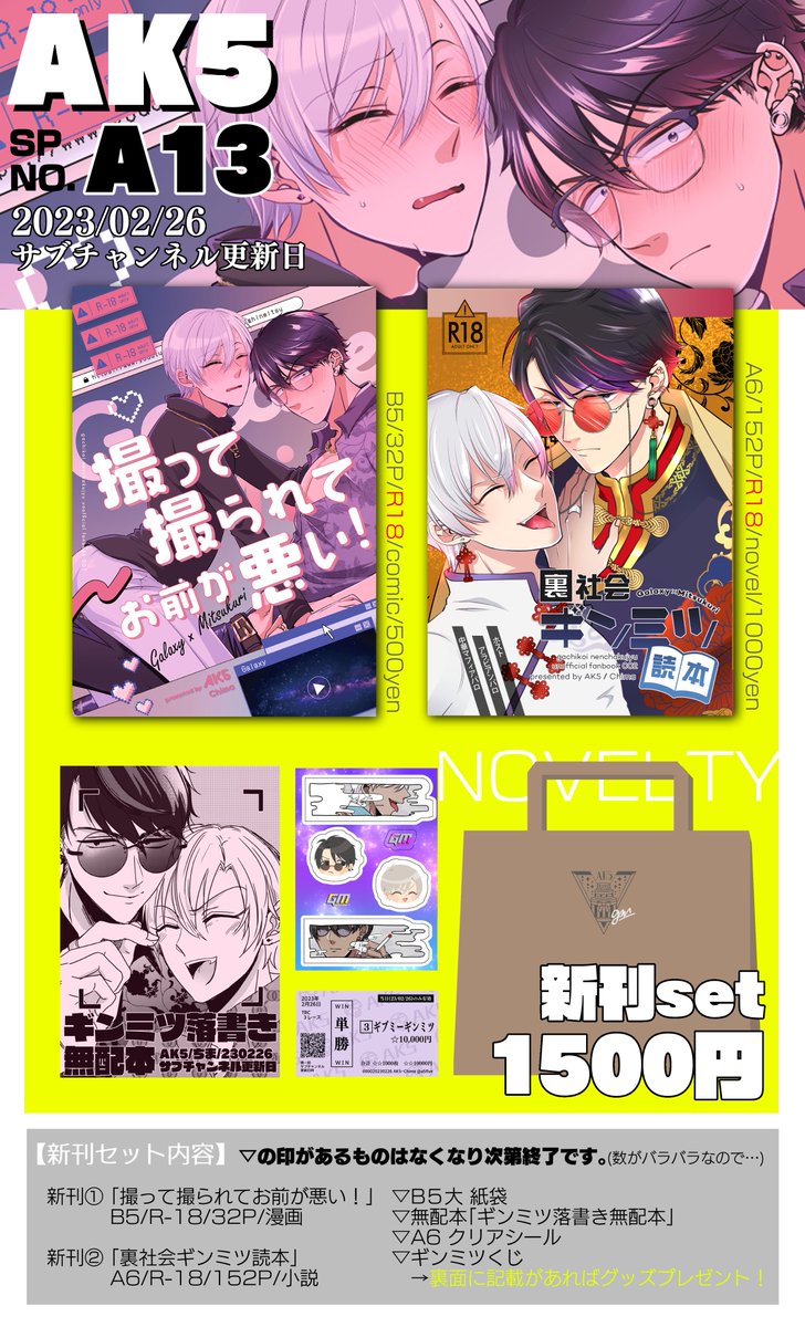 2/26 サブチャンネル更新日 お品書きです 「AK5」【SP:A13】 ギンミツ本2種類(漫画・小説)とノベルティ4種あります~明後日!だ! 🐯通販 漫画→ec.toranoana.jp/joshi_r/ec/ite… 小説→ec.toranoana.jp/joshi_r/ec/ite… サンプルPIXIV→pixiv.net/artworks/10561… 詳細固定のツリーにまとめてます!