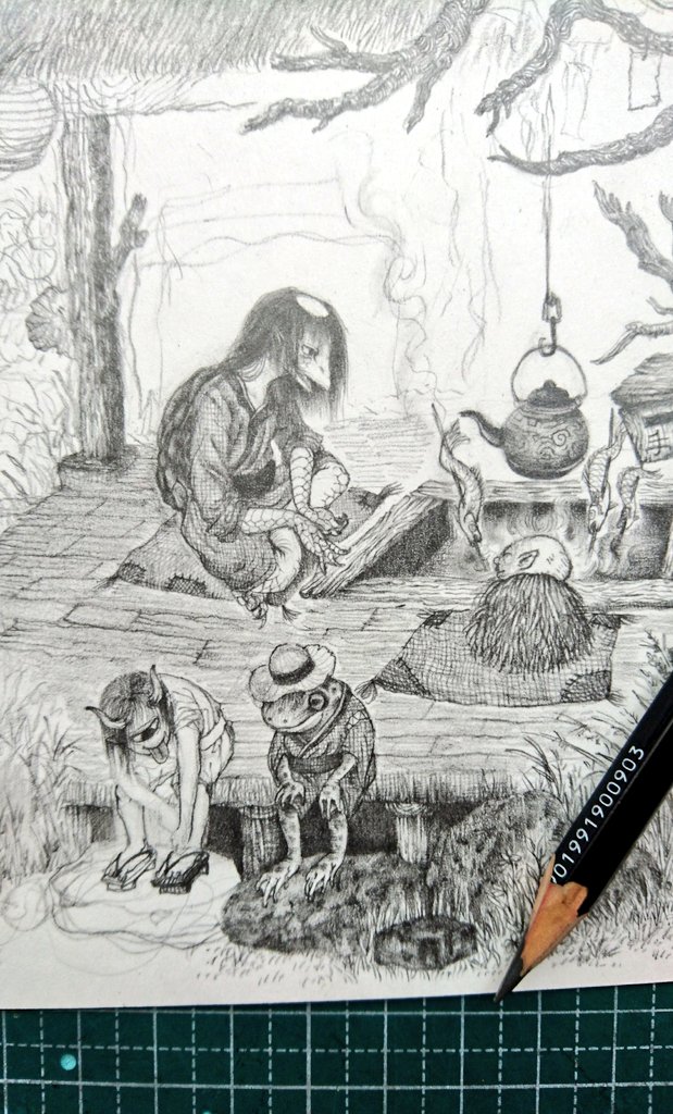 蛙くんの甚平まで描きました。 #途中経過 #妖怪 #河童 #蛙 #一つ目鬼