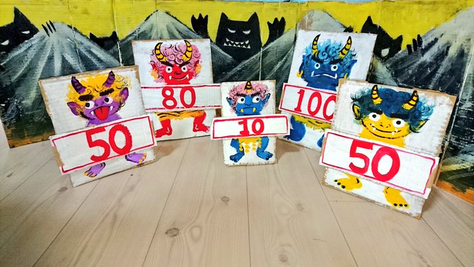 2 9 この前の、私が描いた鬼ちゃんが的当てゲームになりました。 なんか、子供達の人形劇の背景みたい。 背景の鬼ヶ島の山蔭は、夫が描きました。 夫婦合作の鬼ヶ島まとあてゲーム🎯👹 職場の施設のお祭りで使うそうです。 #記念 #鬼 21/08/25 09:51