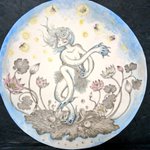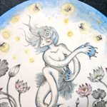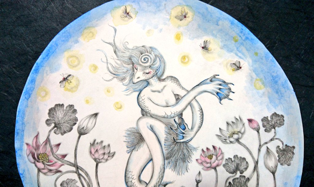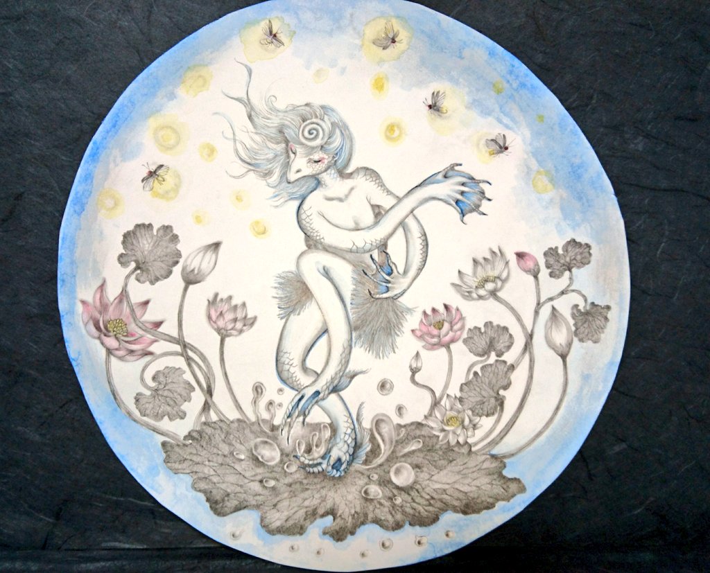 6 84 「踊る 白河童」 藍染池の 睡蓮花 泡沫散らし ひらく水掻 扇の如く 踊り捧げよ 白河童 #完成 #河童 #妖怪 #神様 #透明水彩 #鉛筆 21/03/19 20:42