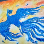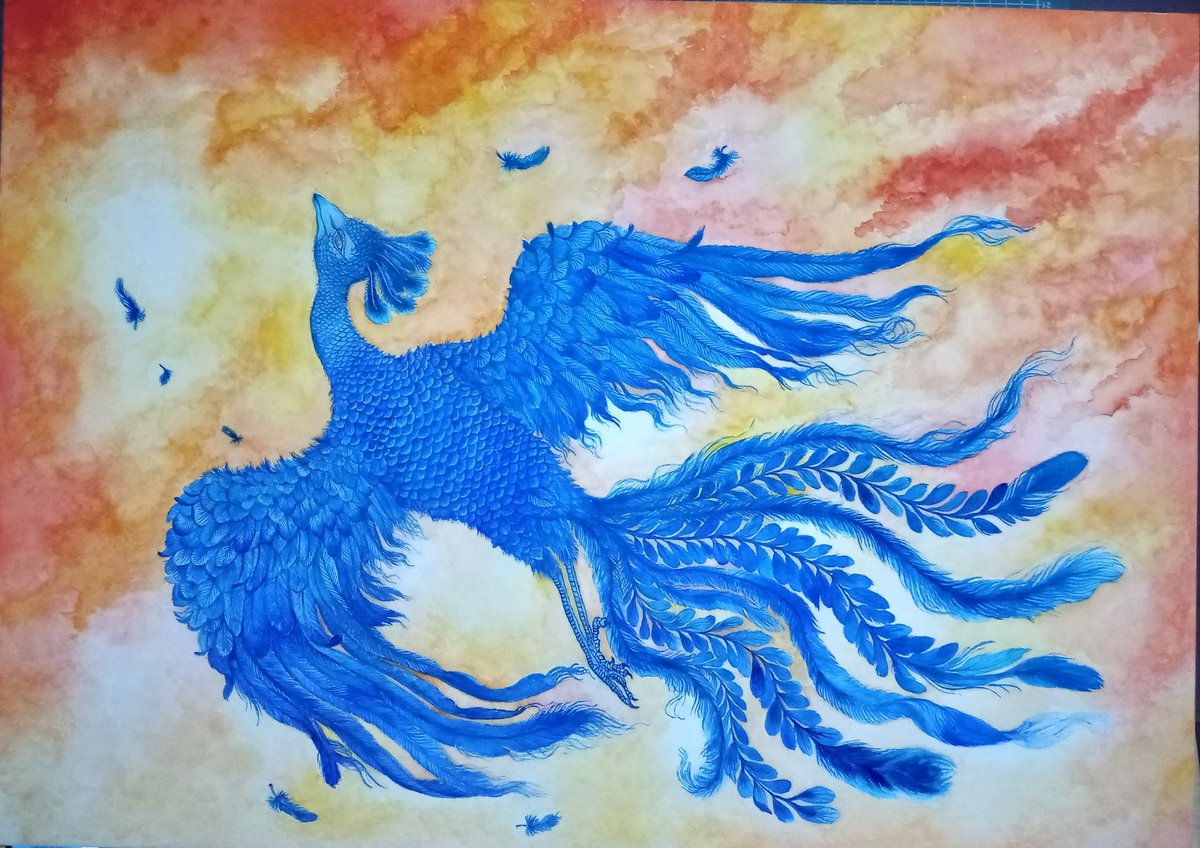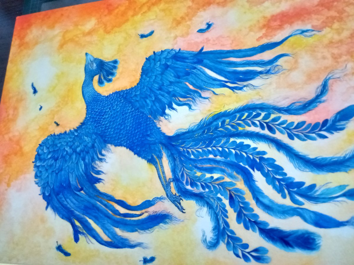 昨日はラメグリッターと格闘してました。机周りがキラッキラで大変でした✨(でも作業としては楽しかった) 写真じゃ伝わりにくいのですが、翼の部分から後方にかけてラメを散りばめ、完成とさせていただきました🦚 #鳳凰 #水彩 #依頼作品 twitter.com/a_4iMizuMe_2…