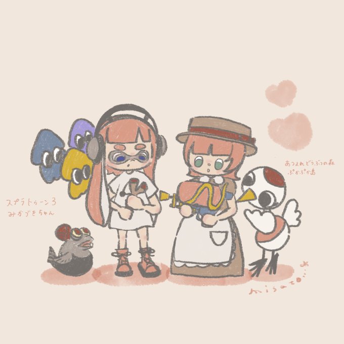 お互いのアイテム交換ごっこ🔫 どうやって使うんだろう?の顔してるつもり 2人ともかわいくてキャラクターに愛着が湧く…😐♡ #illustragram #イラスト #ゆるいイラスト #スプラトゥーン3 #あつまれどうぶつの森