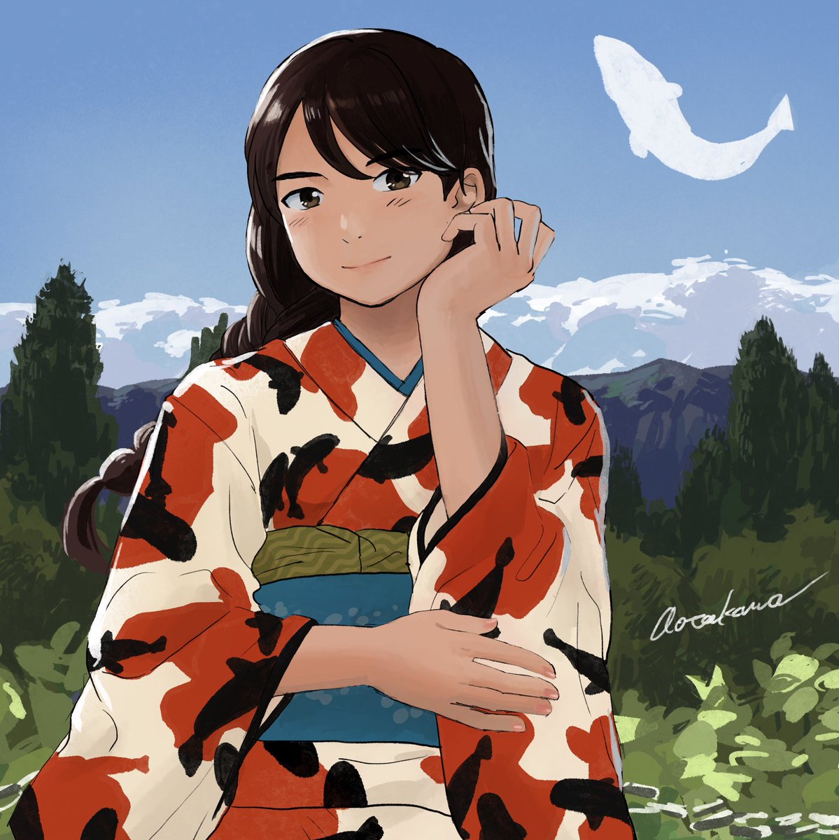 山古志アート5作目を制作しました。 背景は「山古志復興交流館おらたる」から見える景色です。 世界錦鯉サミットの開催を記念して、錦鯉柄の着物を描きました。 #NishikigoiNFT 山古志アートについて note.com/a_tk_02/n/n583…