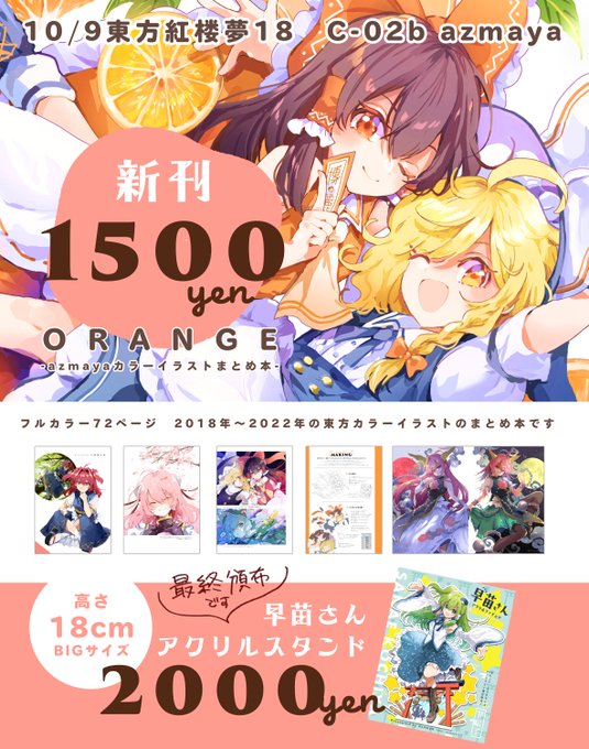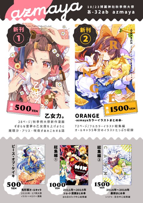 昨日の秋季例大祭ありがとうございました!✨✌️ 新刊はメロンブックス様に委託しておりますのでご興味ありましたらどうぞよろしくお願いします~!ご感想もとてもうれしいです!! 新刊①乙女力。 melonbooks.co.jp/detail/detail.… 新刊②ORANGE-azmayaカラーイラストまとめ本- melonbooks.co.jp/detail/detail.…