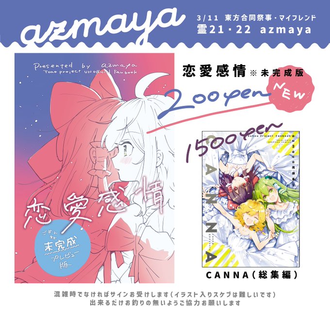 🍁次イベント→秋季例大祭(夏コミ/紅楼夢不参加) 🌸春例大祭新作グッズ BOOTH:azmaya.booth.pm 📙同人誌委託 メロン:melonbooks.co.jp/circle/index.p… 電子:bookwalker.jp/label/4886/ 📚商業単行本 東方茨歌仙(作画担当)/東方二次創作連載 amazon.co.jp/%E3%81%82%E3%8…