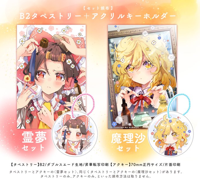 【例大祭20新作グッズ・BOOTH通販開始!】 セットでなくバラでの販売となっています!よろしくお願いします! ⭐️タペストリー ・霊夢 →azmaya.booth.pm/items/4798220 ・魔理沙→azmaya.booth.pm/items/4790349 ⭐️アクリルキーホルダー ・霊夢 →azmaya.booth.pm/items/4798266 ・魔理沙→azmaya.booth.pm/items/4798259