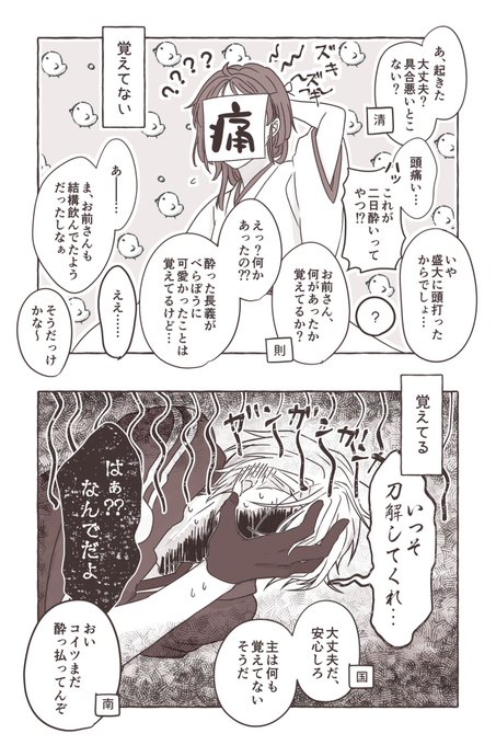 184 2554 恐らく清光・則宗・国広・南泉に酒をしこたま飲まされた後、「あー!あんなところに主がいるー!?ほら行っといでよー!」って送り出されて一部始終を見守られていました(2/2) 22/04/12 22:48
