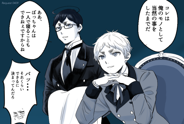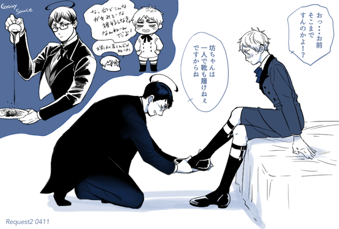46 249 リクエスト くろしつじパロ でも、リク主はこういうのが見たいわけじゃない気がするんだけど…書き直したほうがいいか。 あ、別にいかがわしいネタじゃないです。 最初着替えも一人でできないって事にしようと 思ったけど、執事って着替えも手伝うから 本気で一人でできないしな…て思って。 23/04/09 21:46