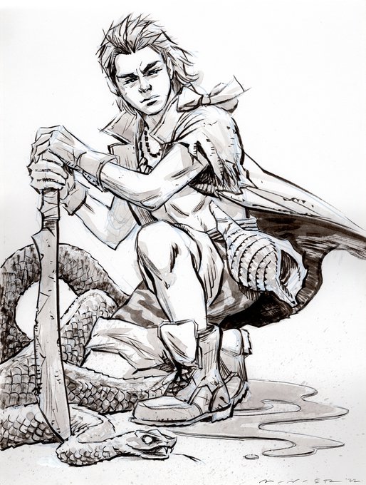 Day 4 : Scallop. Eli, from MGSV — who grows up to become the villainous Liquid Snake. My mind first went to a character associated with a shell, but then realized scallop could be the pattern seen in the snake. #inktober2022 #inktober @inktober #metalgearsolid #GearTober