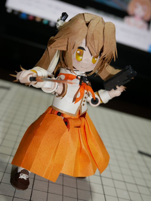 差し上げたものなので到着するまでは…と思っていたのですが無事辿り着いたようなので。 何時ものようにすべて紙製、スカート、前髪や耳含め大体動きそうなところは全部動きます。ドスとチャカはご本人と同じく現在寝床の下に隠してあります。(続く) #はねるあーと