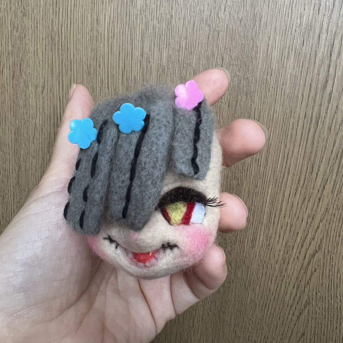 2 20 どうせ見えないだろうと作った眉毛。前髪空間空くようにしたせいかくっきり見える!やったね!! ちょっとアヘってるのがかわゆ! #羊毛フェルト 22/09/04 16:33