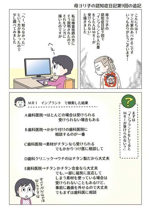 こんにちは~!認知症になった母のマンガ、前回の追記です。インプラント、入れ墨、アートメイクの人は、MRI撮れるのかい撮れないのかいどっちなんだいの件。反響を頂いたので少し調べてみましたよ。フォロー、リツイートを頂けると嬉しいです!#認知症 #コミックエッセイ #漫画が読めるハッシュタグ