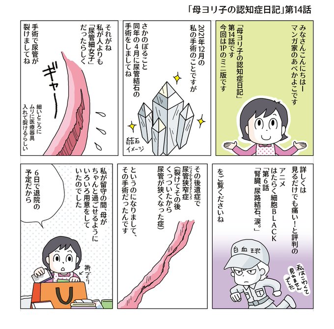 ども!漫画家のあべかよこです!「 #認知症 になった母のマンガ14回」です!結石がこんなにこじれる人はそういないらしいので、石持ちの方はご心配なさらぬよう。ほぼ薬で石がでるそうです。尿管細女子同盟でもつくろかな。フォローRT嬉しいです!見てね!#コミックエッセイ #漫画が読めるハッシュタグ