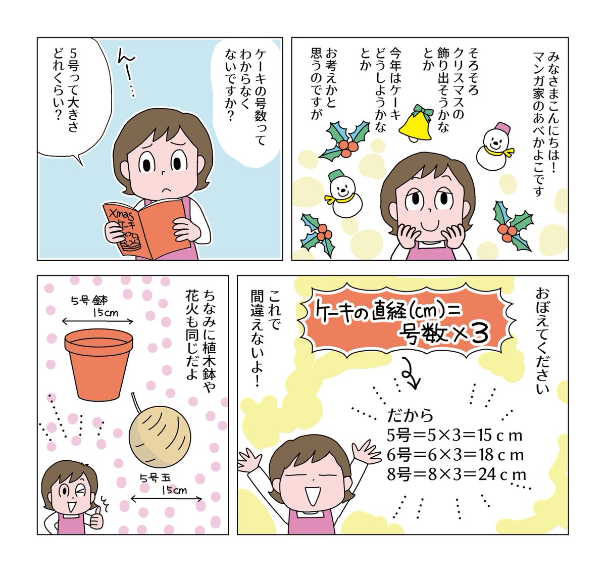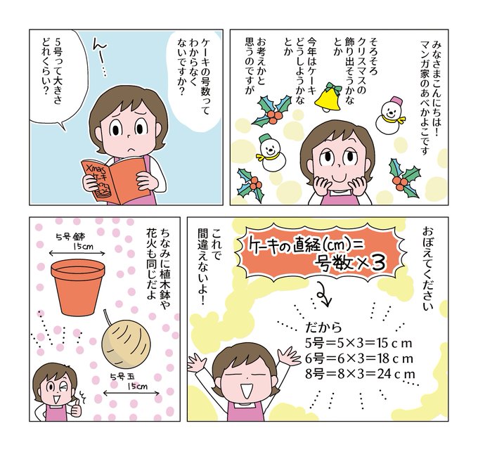 今日のマンガ。昨年ケーキのサイズのことをつぶやいたら反応を頂いたので今回はマンガにしてみました。ケーキのサイズってよくわからなくないですか?でも一度おぼえたらもう大丈夫!でもさ、「5号サイズ:3~4人分」って…少なすぎない?1人分だよねえ?#コミックエッセイ #漫画が読めるハッシュタグ