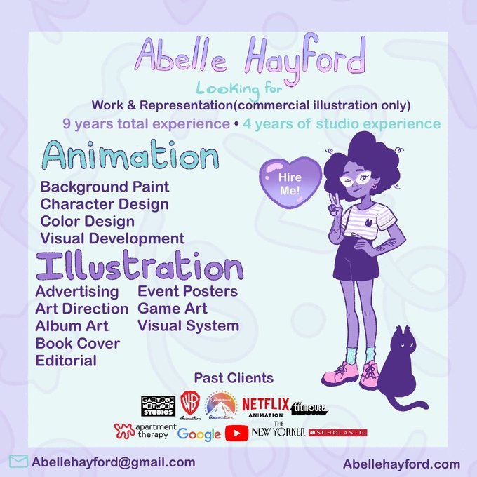 Hi everyone It’s abelle! I’m a black queer LA based illustrator Currently looking for both full time and freelance work and representation(commercial illustration only).available to start ASAP 💜Thank you💜 abellehayford.com 💌abellehayford@gmail.com